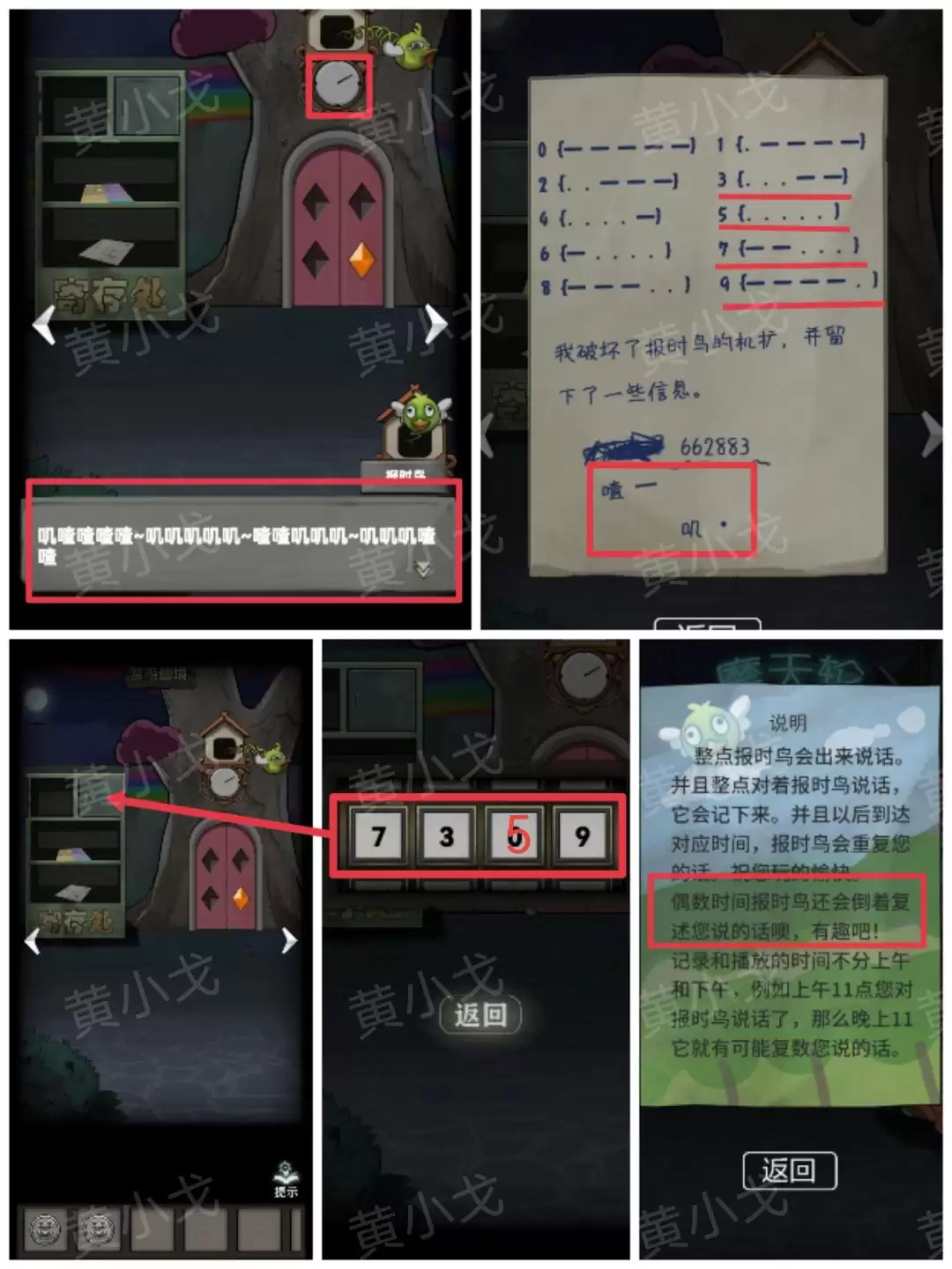1、首先,留意一下铁网上的那张说明书。关键信息就一句话:偶数时间报时鸟会倒着复述说的话。 这个线索先记着,后面有大用。