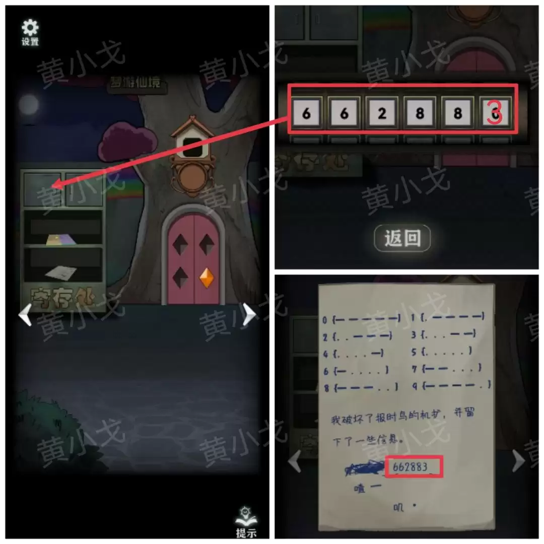 11、重头戏来了。现在点击储物柜右侧柜门上的密码锁。这里的密码需要结合三个线索来破解: