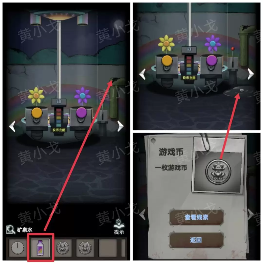 13、来到游戏设备前,看到那根透明的管子了吗?把【矿泉水】倒进去。水流会冲出一枚卡在里面的【游戏币】。物尽其用。