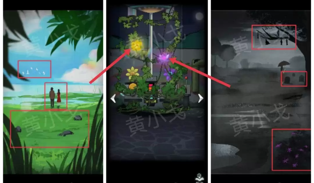 来到这个区域,点击那两朵并生的花,你会进入一个短暂的幻境。注意力要集中,记住幻境中间出现的各种物件的数量,这是破解后续关键密码的核心。
