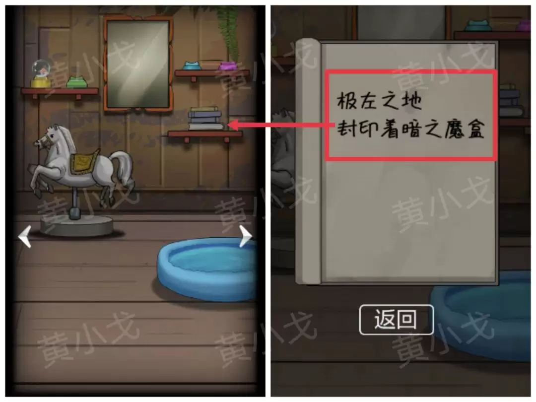 镜子旁的架子上也有一本书。翻开它,你会得到一句提示:“极左之地,封印着暗之魔盒”。这句话很直白,指明了某个重要物品的获取方向。