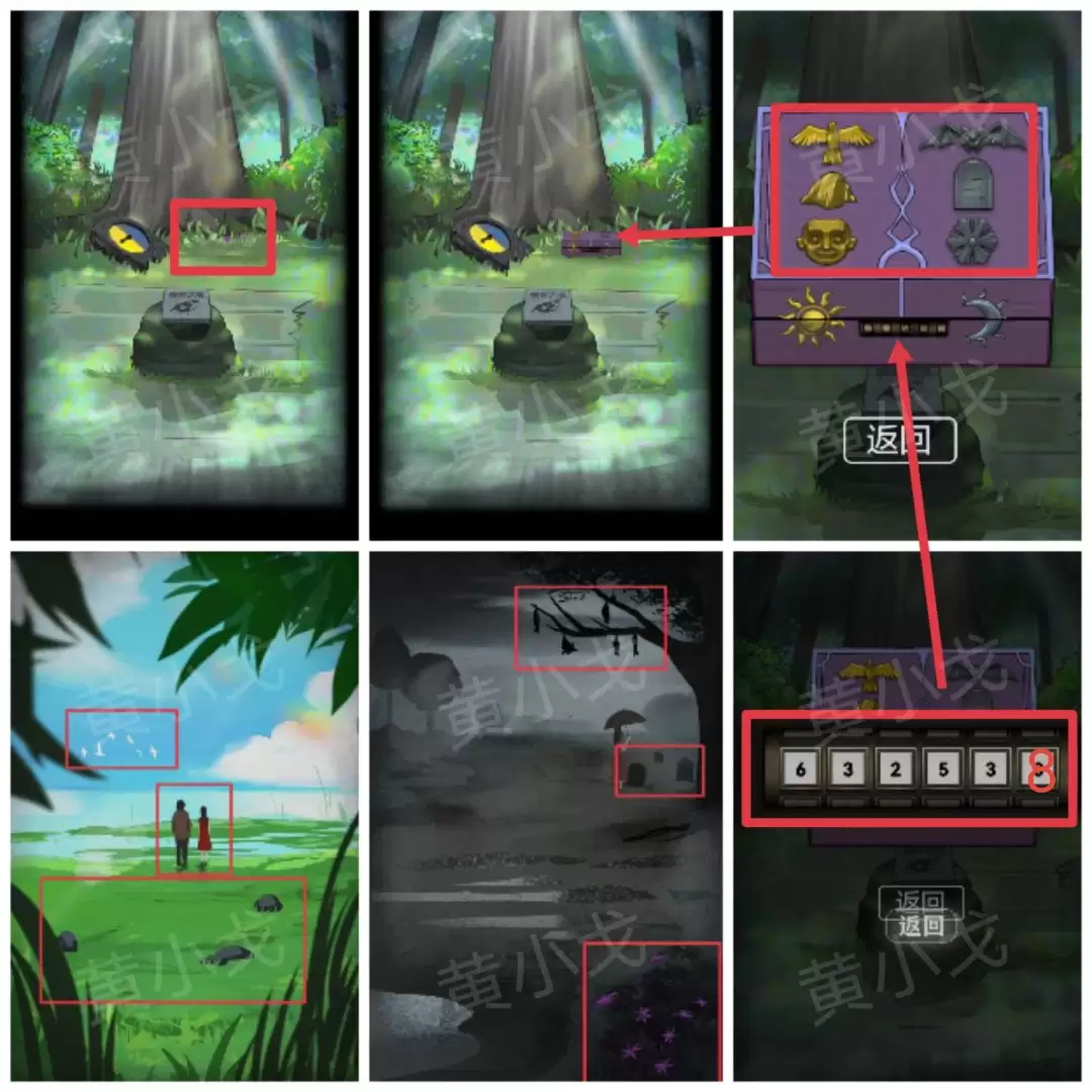 点击大树根前的盒子。盒子上有图案提示(黄色对应鸟、石头、人;黑色对应蝙蝠、墓碑、花)。破解密码的关键,在于结合之前在【游戏设备】幻境中看到的各物品数量:鸟-6、石头-3、人-2、蝙蝠-5、墓碑-3、花-8。因此,输入密码:632538。