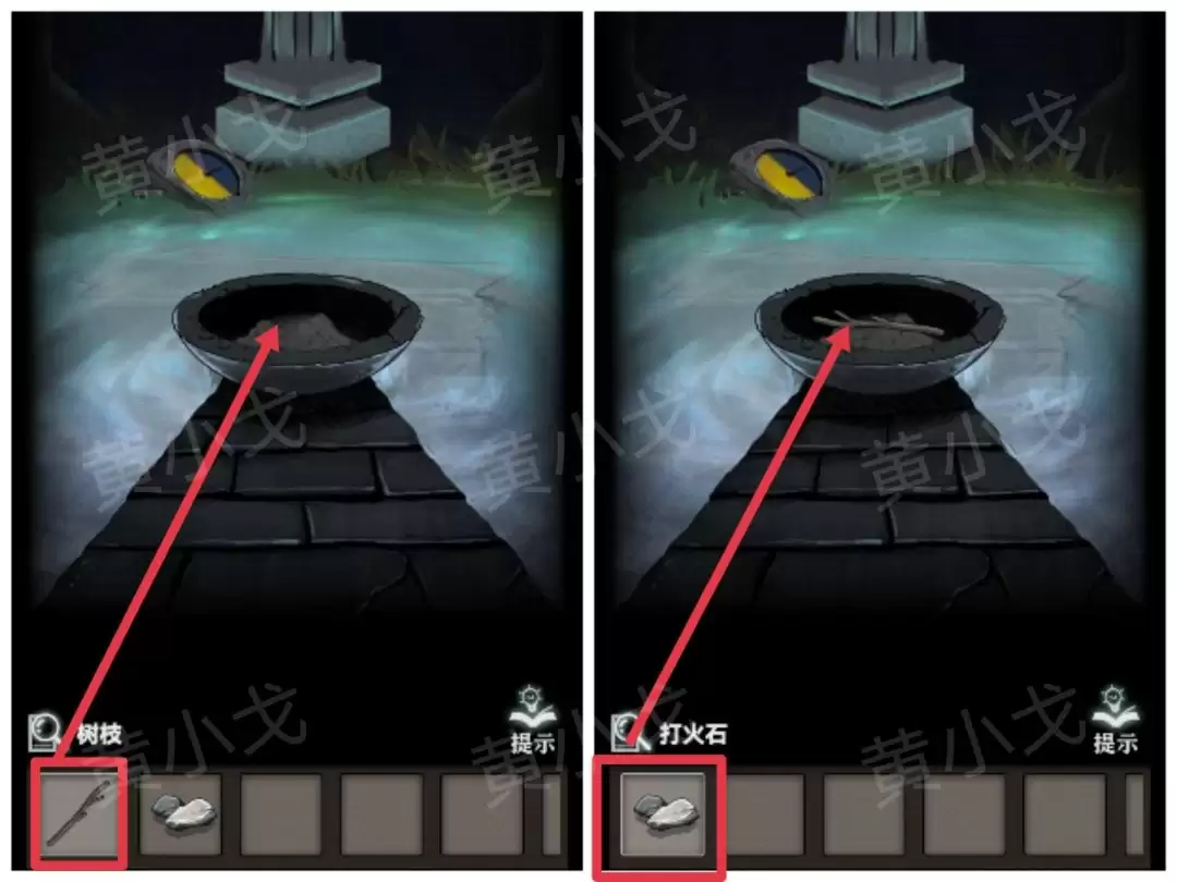 点击场景中的圆盘,切换到神之梦的黑暗面。将【树枝】放入火盆,然后用【打火石】点燃它。这个火盆也是之后离开神之梦的出口。