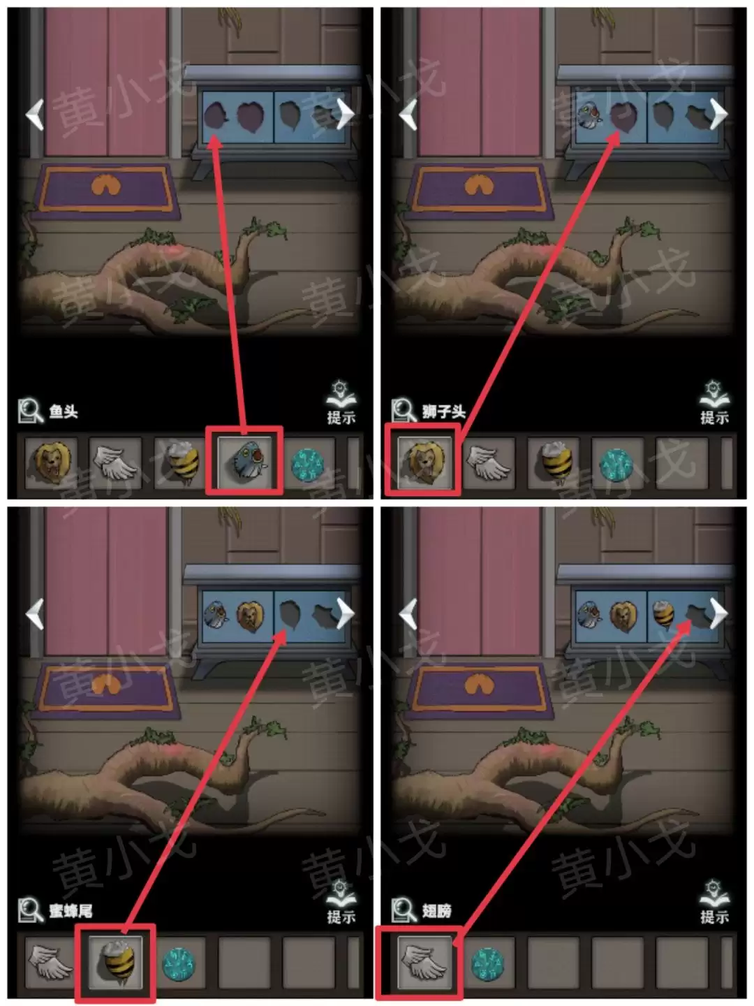 进入屋内,你会看到一个带凹槽的柜子。把背包里已有的【鱼头】、【狮子头】、【蜜蜂尾】和【翅膀】,按照形状对应嵌入。严丝合缝就对了。