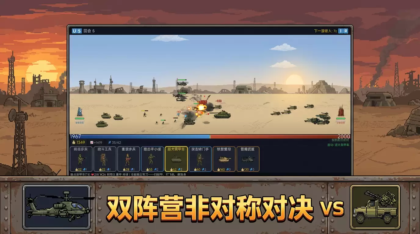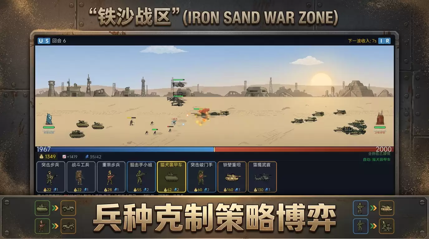 简单来说,《铁沙战区》是一款主打非对称策略的对战游戏。它的核心乐趣在哪里?首先,你需要选择一个阵营,然后精心编排你的兵种组合。战斗过程是自动出兵,但千万别以为这就成了“挂机游戏”——真正的胜负手,在于你在横版沙漠战场上的运筹帷幄。如何利用兵种间的克制关系,如何高效管理资源进行经济博弈,最终击溃对手的基地,这才是考验玩家策略深度的关键。可以说,它把策略的“脑力”对决,放在了非常核心的位置。
