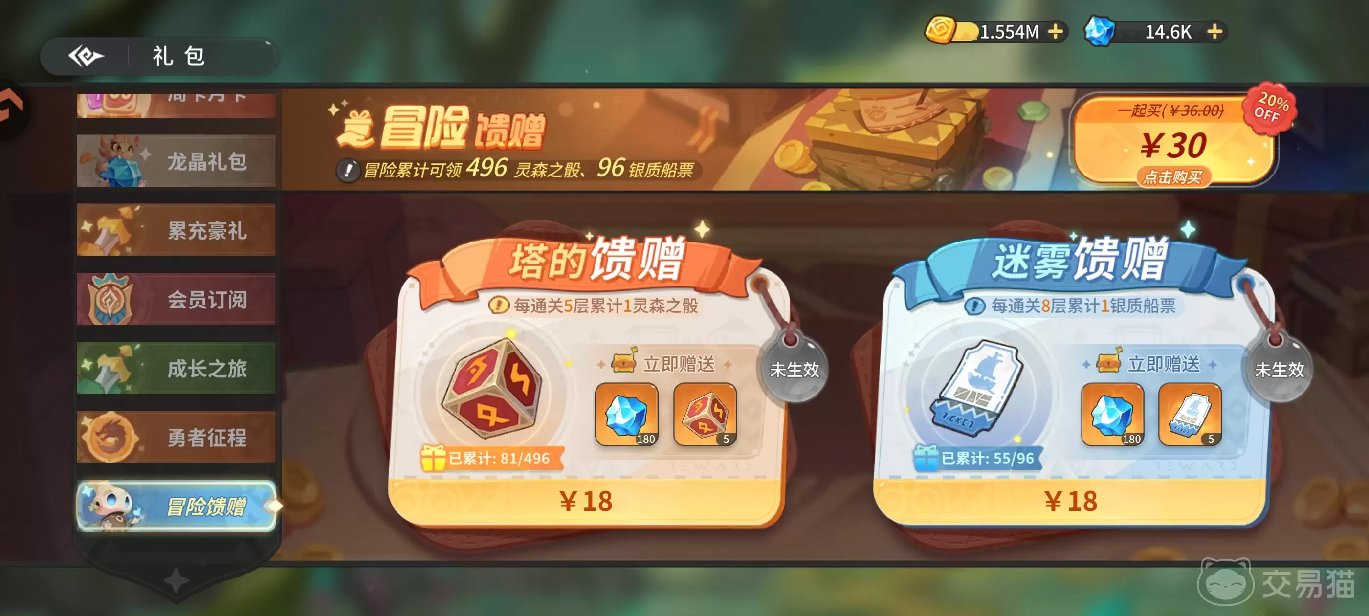冒险馈赠:售价30元,购买即得180龙晶、5灵森之骰、180龙晶、5普通角色招募券;后续每通关5层塔额外奖励1灵森之骰,通关8层再获1张普通角色招募券。