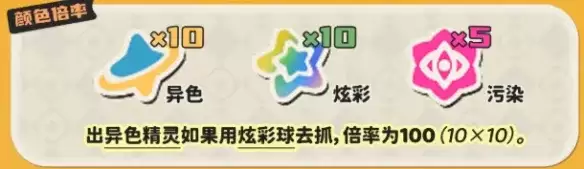 这里有个顶级技巧:如果你用炫彩球去捕捉异色精灵,那么颜色倍率将是 10 × 10 = 100!这才是实现收益最大化的核心操作。
