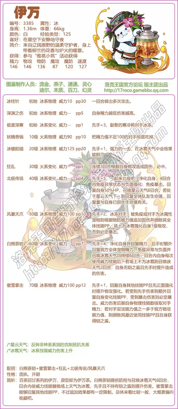 其核心技能“白熊茶铠”是战术展开的基石。该技能不仅提供了关键的防控效果,更能直接召唤持续6回合的冰雹天气。尤为重要的是,在冰雹天气生效期间,伊万使用任何威力技能时,都会强制将场上天气覆盖为冰雹。此外,若技能先手出手且自身未处于“铠之盾”状态,还能获得额外的伤害提升效果,这为后续的爆发创造了条件。