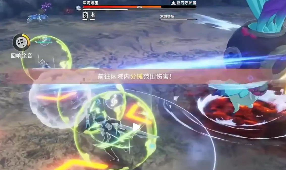 战斗持续一段时间后,深海娜宝会点名全队,随后在玩家周围生成水泡,并发动大范围的全屏攻击。应对方法其实很清晰:迅速进入与自己头顶音符颜色相同的水泡中。只要找对了,就能毫发无伤。但若站错水泡,或是反应慢了没进去,承受的伤害将非常致命。这一机制听起来简单,实战中却极易因慌乱出错。所以,被点名的瞬间,先看清自身标记,再立刻搜寻对应水泡,才是最高效的做法。