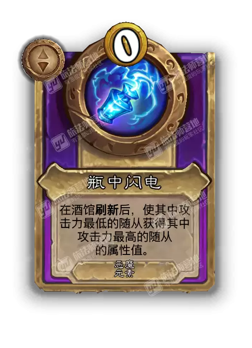 从种族与费用来看,瓶中闪电是一个0费的“恶魔+元素”混合类别单位。其核心效果极具策略性:在你每次刷新酒馆后,它会自动触发,精准定位酒馆中攻击力最低的随从,并使其立刻复制攻击力最高随从的完整属性(包括攻击力与生命值)。