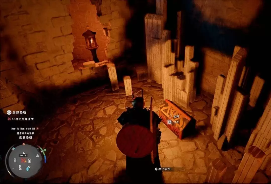 到达下层后,场景较为开阔。您首先会看到“净化圣所”任务相关的任务道具——一个方块。而我们的目标,那个用于解除机关的石灯笼,就在这个方块的旁边。上前互动将其点亮,即可使入口房间的尖刺陷阱失效。