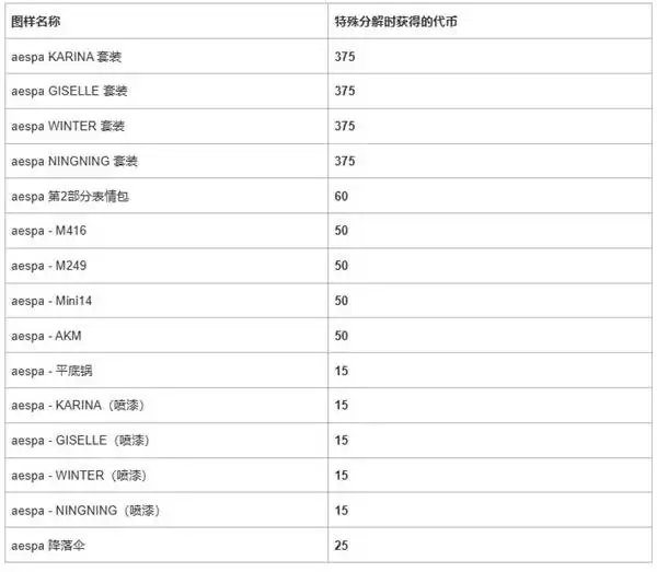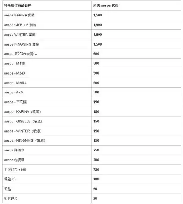 aespa物资箱包(x1):售价250 G-Coin或10,000 BP,购买即赠15个aespa代币。