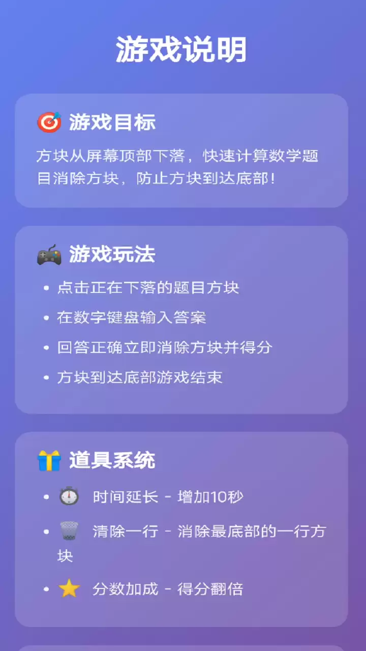 操作上极其直观:点击正在下落的题目方块,弹出数字键盘,输入答案。答对,方块瞬间消除,分数到手。这里有个小窍门:答题速度越快,获得的分数加成就越高,这可是冲击高分的关键。