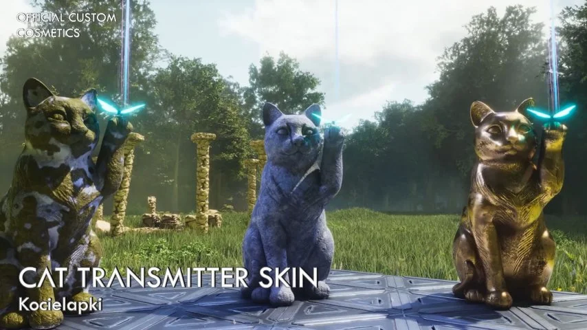 由Kocielapki打造的猫咪传送信标皮肤模组则是一份免费的视觉福利,现已登陆官方服务器。该模组提供了石头、苔藓、金色三款全新外观变体。其中,石头和金色变体可以分别对猫雕像和蝴蝶部件进行独立上色,苔藓变体则仅支持蝴蝶上色。启用模组后,信标会呈现出非常明显的发光光束,视觉辨识度极高,为玩家点亮方舟各处地标提供了既美观又个性的选择。