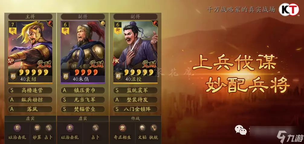 若追求更高上限:SP袁绍带刚勇无前+绝其汲道/万箭齐发;SP朱儁带落凤+纵兵劫掠;沮授带无当飞军+八门金锁阵。