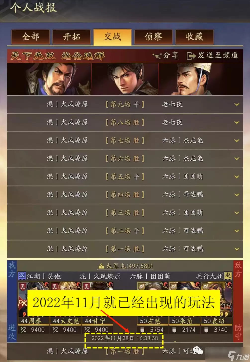 看到这个队伍,不禁想起盟友“混团丨火凤燎原”早在2022年11月就用过几乎相同的配置,并且打出了“天下无双”的战绩。