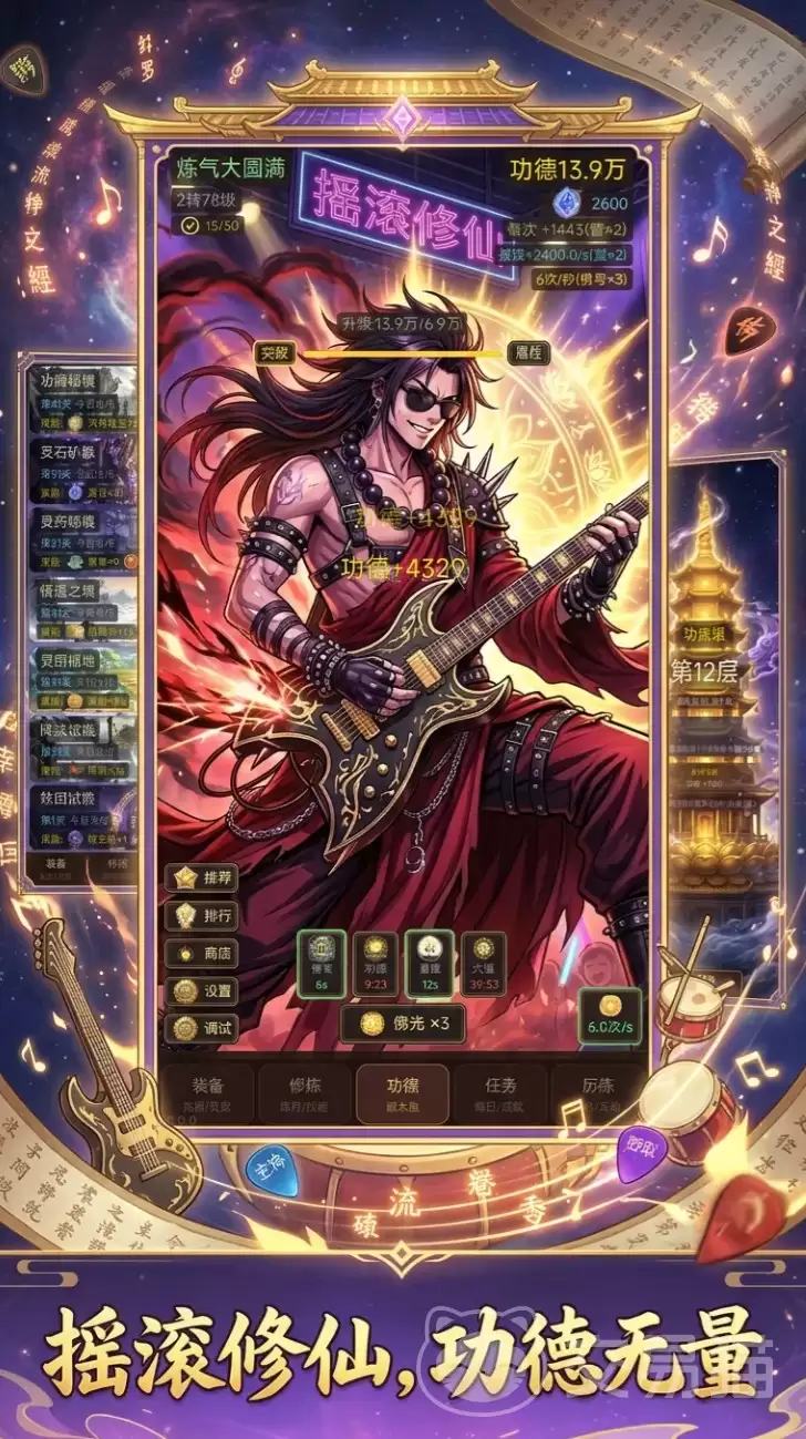 聊到玩法,这才是关键所在。《积点功德》的核心机制,简单到令人会心一笑——就是“敲木鱼”。玩家通过点击屏幕完成敲击动作,每一次清脆的“笃笃”声,都在为你累积宝贵的功德值。这些功德用处可大了,既能净化角色身上缠绕的煞气,更是转化为修为、推动等级成长的核心资源。当然,如果只是单调的点击,难免乏味。但这款游戏巧妙之处在于,其背景音乐融入了现代摇滚元素,节奏感十足,让重复性的操作瞬间有了韵律和趣味,非常契合现代人利用碎片时间放松一下的需求。