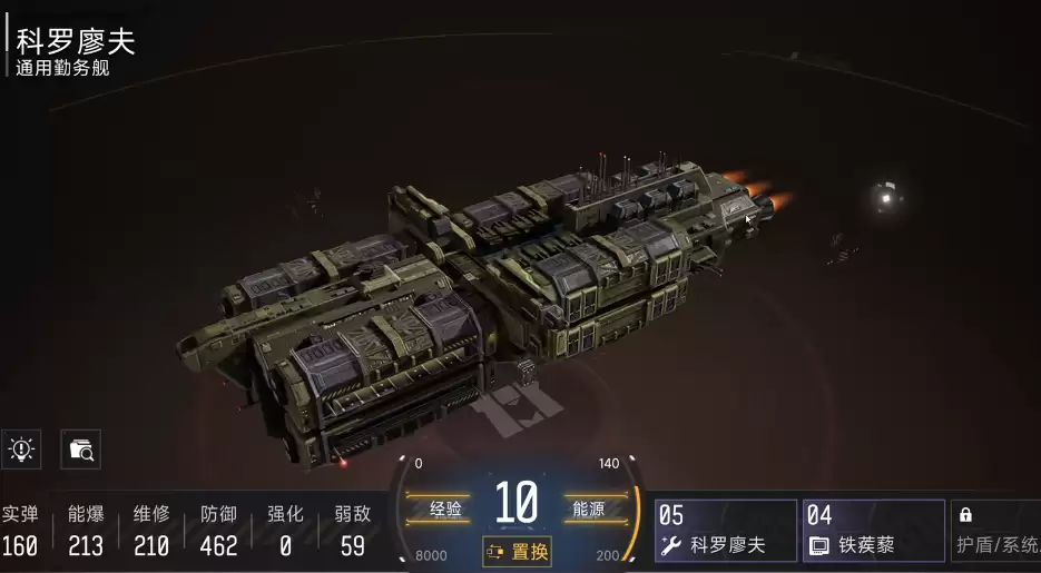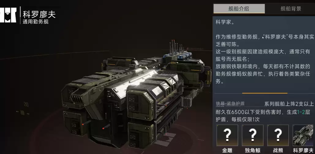 科罗廖夫在游戏里被定义为“通勤舰”,招牌能力是提升整个舰队的航速。千万别小看这个属性,在各类扫描、探索玩法里,船速直接决定了你的资源搜集效率和发育节奏。不过,它的价值可不止于此。实战中,这艘船默认会被布置在前排,这意味着它要替整个队伍扛下第一波最猛烈的火力。所以,它的生存能力有多强,直接决定了你的团队能持续作战多久。基于这个逻辑,它的装配策略就非常明确了:一切向防御看齐。优先堆叠护盾强度、提升护盾充能速率、加固基础耐久,这才是正解。至于攻击类模块?可以说,装上去就是妥妥的资源错配,反而会削弱它作为功能盾舰的核心价值。