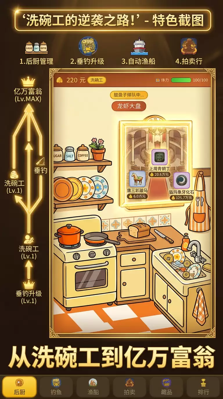 从洗碗工起步,一路奋斗成为亿万富翁——光是这个主题,就足够吸引人了。游戏的核心玩法相当丰富,你不仅能体验从基层做起的模拟经营,还能参与到钓鱼、操作自动渔船、甚至是在拍卖行里一展身手等多种活动中。换句话说,它可不是一款单调的“洗碗模拟器”,而是一条融合了多种趣味元素的综合成长路径。
