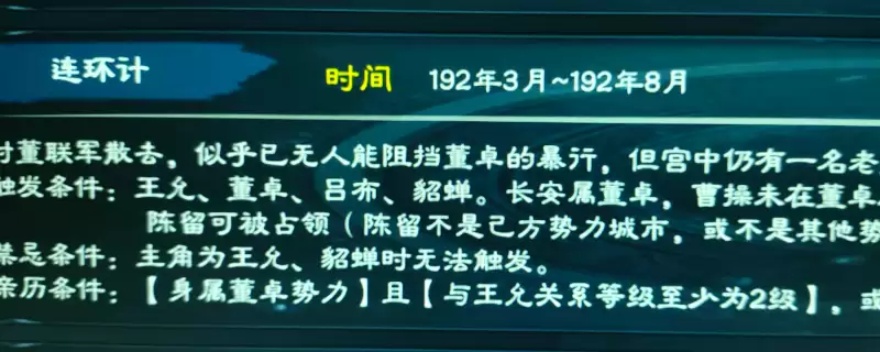 不过,加入董卓势力可不仅仅是找个工作那么简单,这背后关联着著名的“连环计”事件链。等你跟着董卓体验完这段风云变幻的剧情,事件结束后,记得主动去找董卓“辞官”。毕竟,在历史洪流中,董卓集团的结局早已注定。有趣的是,如果你完成了“连环计”事件,董卓和王允都会退场,而你和吕布的关系大概率会直接跌至冰点。