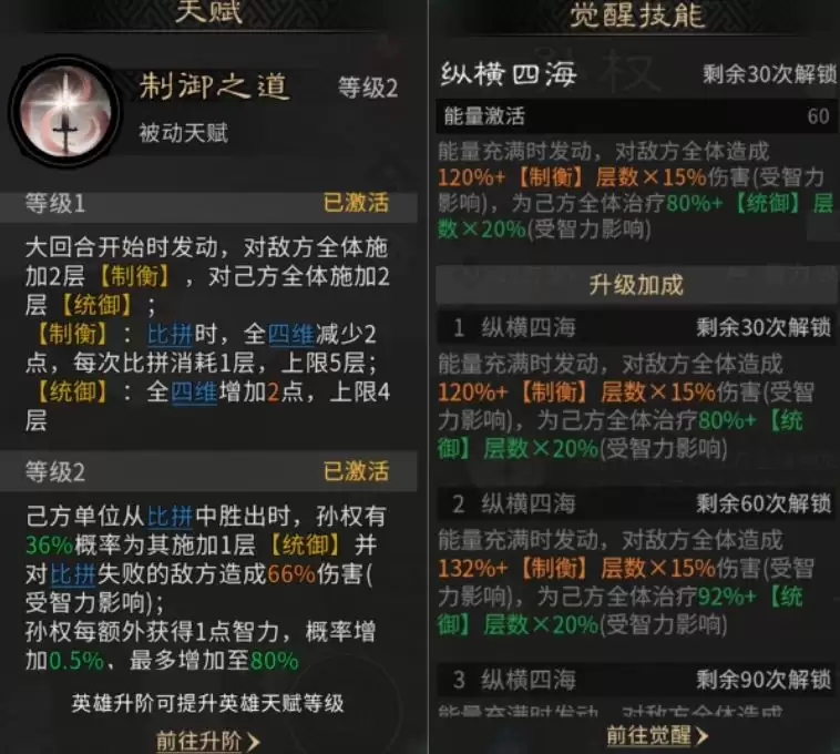 孙权的觉醒技能【纵横四海】,是一个兼具高额群体伤害与群体治疗的综合型技能。其威力并非固定,而是随着战斗回合推进动态成长。孙权通过天赋累积的【制衡】(敌方减益)与【统御】(己方增益)层数越多,此技能的最终伤害与治疗量就越高。因此,这是一个典型的后期决胜技能,越到战斗尾声爆发力越强,完美契合其长线运营的战术定位。