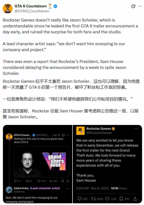 在游戏圈,知名记者Jason Schreier的名字总是伴随着争议。最近,博主GTA VI_Countdown的一则爆料,再次将这位以深度调查闻名的记者推上风口浪尖。据称,大量游戏&开发者私下对其颇有微词,甚至像Bethesda这样的大厂也对其感到反感。更戏剧性的是,有报道指出,Rockstar总裁Sam Houser曾一度考虑将某款游戏的公告推迟一周,目的仅仅是为了“报复”Jason Schreier的提前爆料。