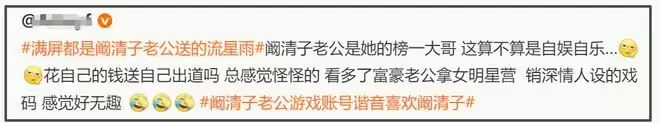 虽然大部分网友沉浸在这对夫妇的甜蜜互动中,但另一种声音也随之出现。有网友认为,这本质上是一场“自娱自乐”,相当于花钱送自己出道。毕竟,娱乐圈里不乏富豪丈夫为明星妻子营销“深情”人设的先例,看多了难免让人觉得乏味。