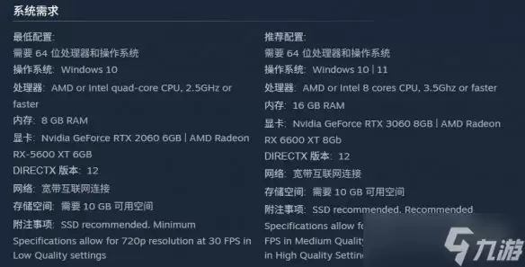 最关键的部分来了——显卡。最低要求是NVIDIA GeForce RTX 2060(6GB显存)或AMD Radeon RX 5600 XT(6GB显存)。这意味着,一些老旧的显卡可能就无法胜任了。此外,游戏需要DirectX 12支持,并且首次运行时需要宽带网络进行验证。最后,请确保你的硬盘上有10GB的可用空间。