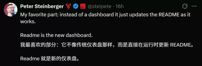 按照传统做法会怎么做?搭建Grafana,配置Prometheus,弄一套精美的后台仪表盘。但Steinberger说:没必要。README就是我的仪表盘。