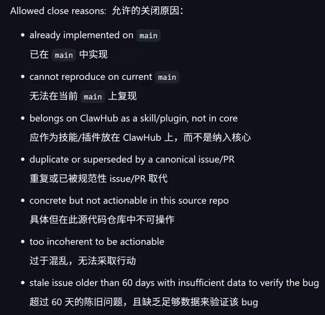 它只在以下七种明确的情况下,才会决定关闭一个Issue:已经在main分支实现、当前main分支无法复现、应归属于ClawHub的skill/plugin而非核心库、重复或已被更权威条目取代、在该仓库内描述具体但不可执行、内容过于混乱无法执行、以及超过60天且缺少足够数据验证的bug。