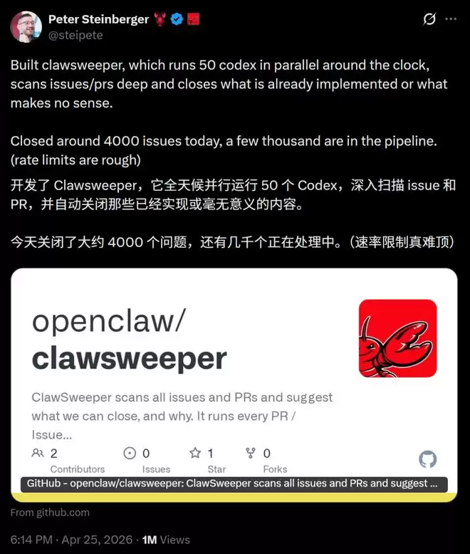 开源社区的维护者们,最近可能都听说了这件有点“疯狂”的事。OpenClaw的创始人、OpenAI工程师Peter Steinberger,用了短短两天时间,搭建了一个名为ClawSweeper的工具。然后,他启动了50个Codex实例,让它们7×24小时不间断地并行扫描。
