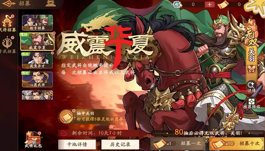 除了新手卡池是30抽保底这个特例外,游戏内其他主要卡池基本都遵循80抽保底的规则。比如“威震华夏”卡池,同样适用80抽保底,但使用的是“灵驼祈愿券”进行招募。其10次招募的保底规则与常驻池类似。但这个卡池有个特点:它拥有关羽作为“UP”(概率提升)武将。更吸引人的是,在这里累计招募达到20次和后续的10次节点,都能获得额外的“杀币”奖励。一旦获得关羽,系统还会赠送更多抽卡券。而且,通过完成关羽的养成任务,还能进一步获取抽卡资源,形成良性循环。