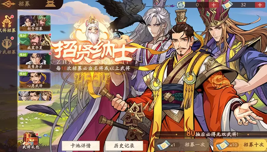 想体验80抽保底机制,最常规的入口就是“常驻招募”。这个卡池长期开放,玩家使用“游园套圈券”进行招募。规则很明确:每进行10次招募,至少能获得一名“名将”或更高品质的武将。而真正的重头戏在于,当你累计招募达到80次时,必定会获得一位“无双”品质的武将——这就是游戏中最基础的保底机制。所以,当你触发这个保底时,目标一定要放在那些版本强势的无双武将上。