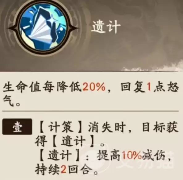 要玩好郭嘉,首先得吃透他的天赋【遗计】。这个技能有两层触发逻辑,非常精妙:第一,每当郭嘉自身生命值降低20%时,会立刻恢复1点怒气;第二,当【计策】效果结束时,他自己还能获得一个持续2回合的10%伤害减免。你看,这已经不是在单纯地“挨打”了,而是一场有计划的“血量交易”。