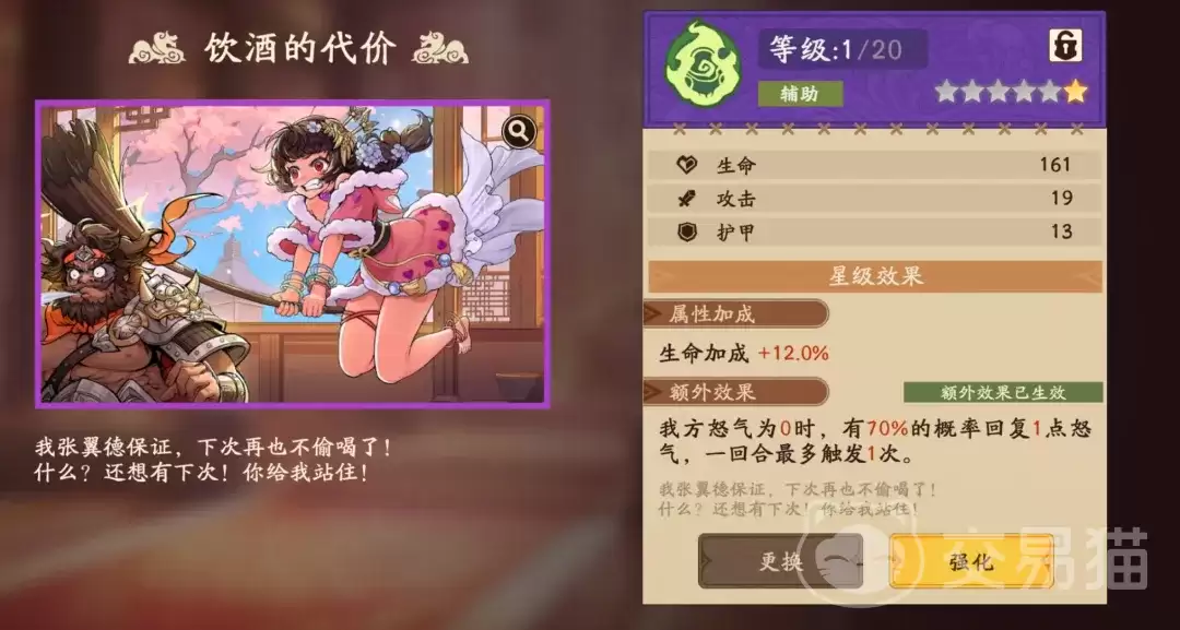 【饮酒的代价】是一个不错的考虑。它能直接提供12%的最大生命值加成,提升基础身板。更关键的是,当己方怒气为0时,有70%的高概率恢复1点怒气。这个效果能有效增强郭嘉及其团队在开局或逆境中的怒气启动容错率,让战术运转不至于卡壳。