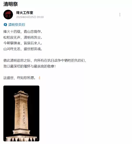 官方发布的配图选用了庄严肃穆的人民英雄纪念碑,画面凝重,并同步附上了一首原创五言诗:“烽火十四载,青山忠骨存。松柏寂无声,清明雨洗尘。今朝擎旗者,皆是后来人。山河终无恙,盛世慰英魂。”图文交融,意境悠远,引发广泛共鸣。