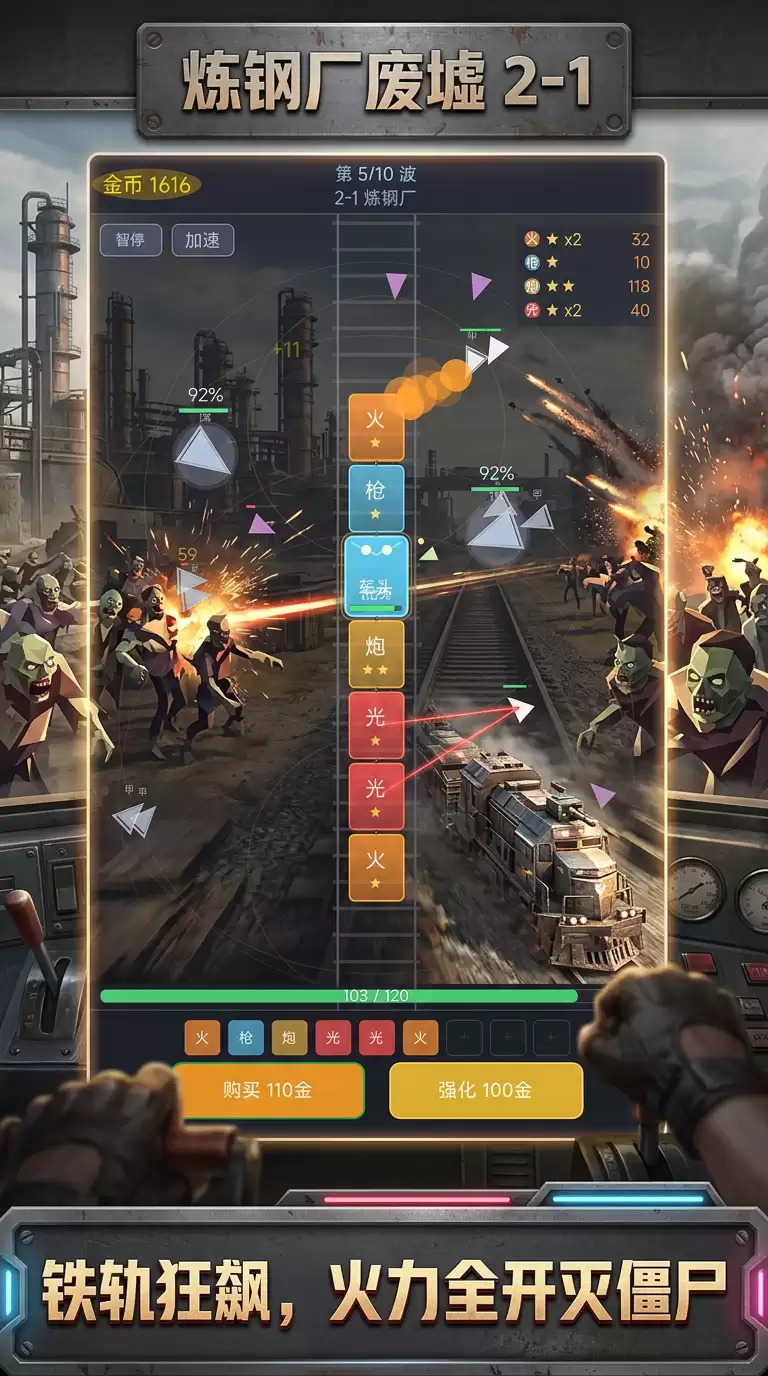 想象一下,驾驶一辆武装到牙齿的列车,在末日废土中穿行,抵御如潮水般涌来的僵尸——这正是游戏的核心体验。玩家需要不断组装和升级列车车厢,从基础的机枪到炫酷的激光、烈焰喷色器等,打造属于你的移动堡垒。游戏巧妙地融合了Roguelike的随机升级要素、塔防的策略部署以及“割草”游戏般的爽快感。每一波战斗结束后,系统提供的随机强化选项,让每一次征程都充满变数和策略抉择,挑战近乎无尽。