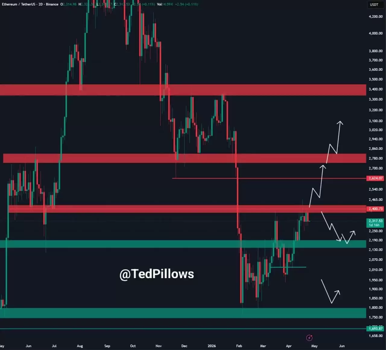 以太坊/TetherUS (ETH/USDT),2日时间框架。来源:X 上的 Ted 枕头