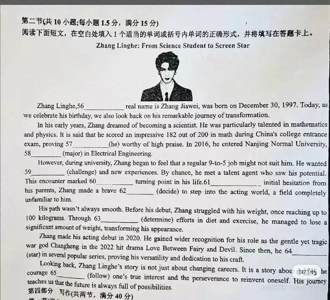 剧集虽已正式收官,但围绕主演张凌赫的讨论却以另一种生动形式持续延展。近日,数份以其个人经历及作品为素材的英语阅读理解题在社交网络广泛传播,引发网友热烈讨论。这位演员的故事与其代表作,竟成为了英语考试中的热门阅读材料。