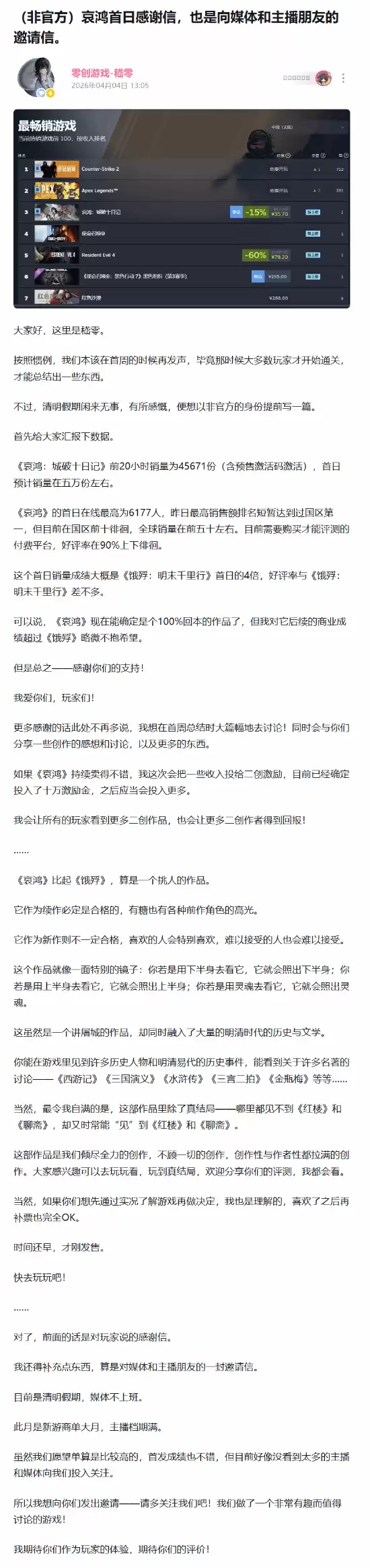 曾打造出百万销量爆款《饿殍:明末千里行》的零创游戏工作室,其新作《哀鸿:城破十日记》自4月3日正式发售以来,虽迅速冲上Steam热销榜,却因制作人嵇零的一则过往言论以及逆天女二林翩翩的塑造,在玩家社区掀起轩然大波。 游戏中的林翩翩,其形象设定并非凭空而来,而是直接取材于《扬州十日记》中对城破后娼妓的