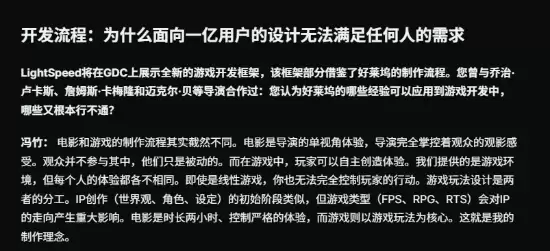 谈及游戏设计的本质,朱峰深刻剖析了游戏与传统线性媒介(如电影)的根本区别:电影是导演视角下的单向输出,而游戏则是开发者与玩家双向互动、共同构建体验的动态过程。