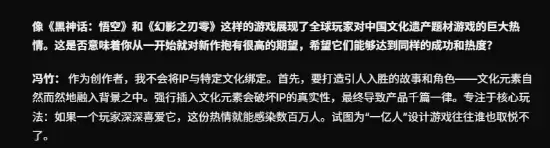 针对近年来由《黑神话:悟空》《影之刃零》等作品引领的文化题材热潮,朱峰也给出了独到见解。他认为,成功的核心并非简单贴上“文化IP”的标签,首要前提永远是塑造出有血有肉的角色和扎实动人的故事。文化元素应当如同灵魂,自然而然地浸润于叙事脉络与角色行为之中,成为作品不可分割的有机组成部分,而非作为生硬的符号进行堆砌。否则,不仅无法增强作品的艺术感染力,反而会破坏其整体的真实感与叙事可信度。