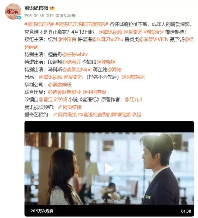 盼星星盼月亮,又一部让人眼前一亮的都市剧终于定档了! 4月13日,由钟汉良、朱珠领衔主演的《蜜语纪》将登陆腾讯视频、爱奇艺双平台全网独播。 消息一出,期待值瞬间拉满。单看预告片里那份熟龄双强的气场、清醒逆袭的决绝,以及势均力敌的情感拉扯,就已经足够让人上头。看来,4月的都市剧市场,要被这部作品强势承
