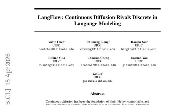 LangFlow:连续扩散语言模型,这次真的行了 这项由美国伊利诺伊大学厄巴纳-香槟分校(UIUC)研究团队完成的工作,已于2026年4月以预印本形式发布,论文编号为arXiv:2604 11748。对技术细节感兴趣的读者,可以通过该编号在arXiv平台上查阅完整论文。 文字生成的“另一条路”,为何