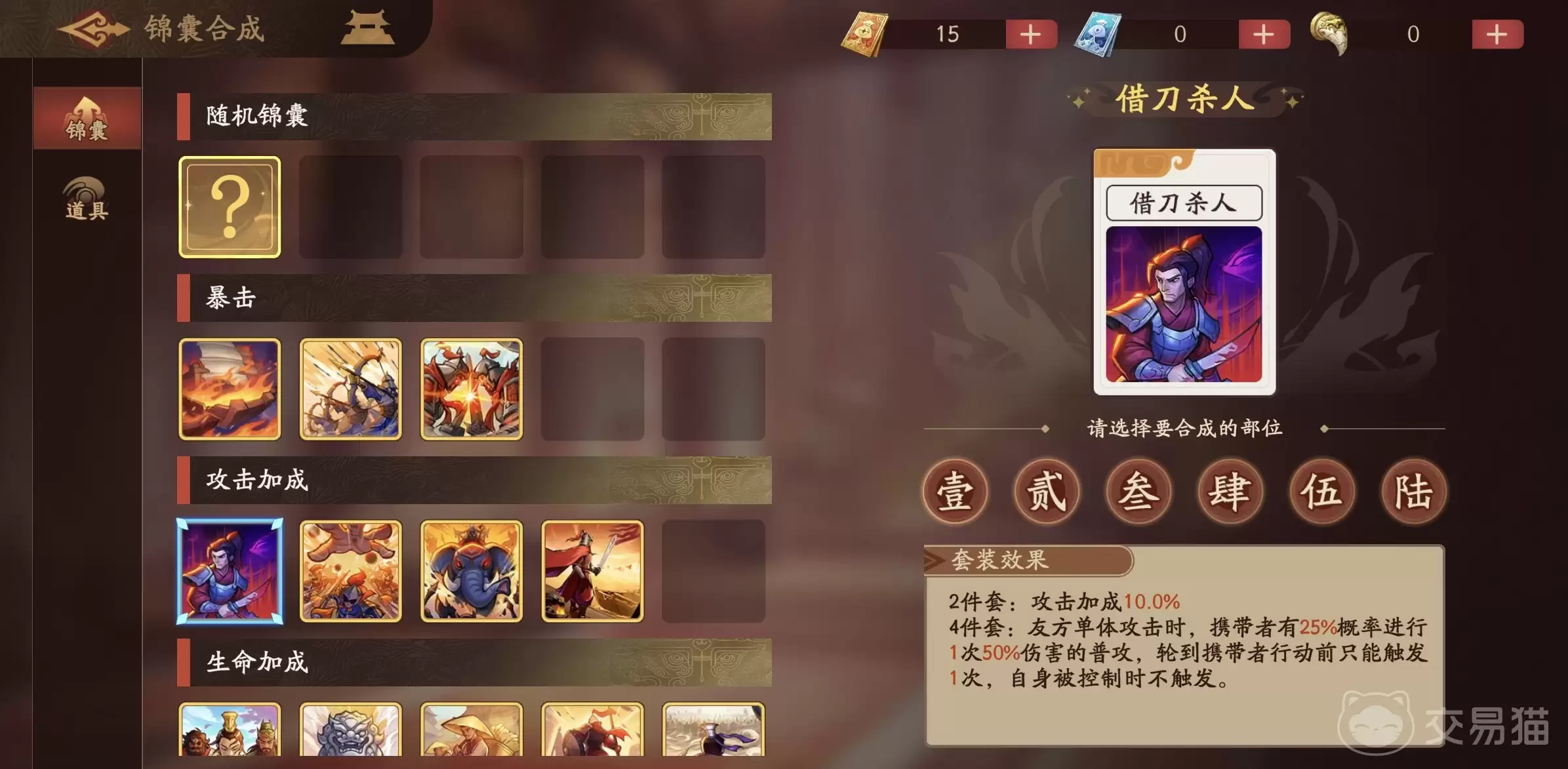 锦囊方面,“借刀杀人”四件套是备受推崇的搭配。它的效果是,当友方进行单体攻击时,钟会有概率追加一次普攻。这进一步强化了他获取“权”的节奏,形成了良性的输出循环。