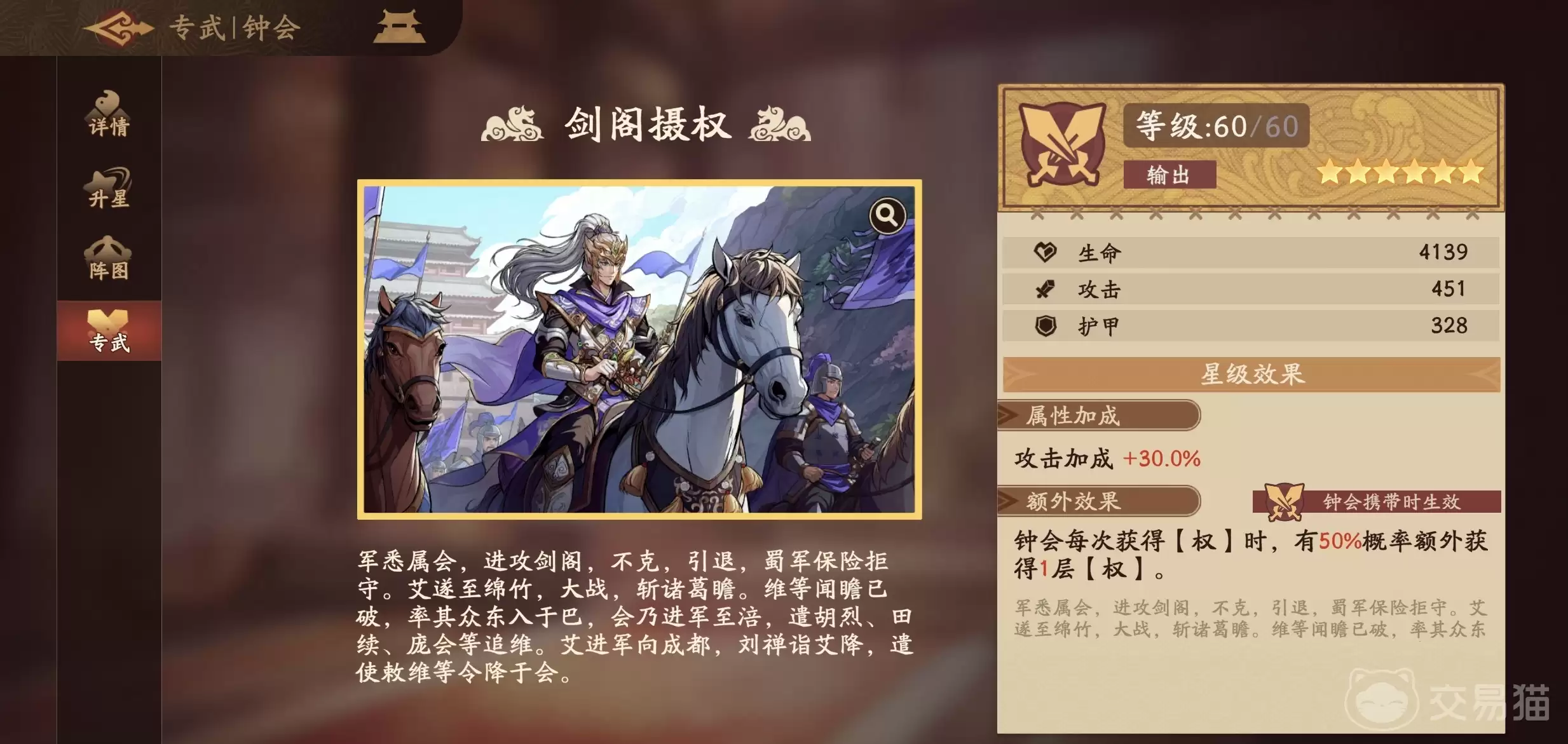 要想让钟会的威力完全释放,装备选择至关重要。专属武器“剑阁摄权”无疑是最优解,它不仅提供基础攻击加成,还有一个核心效果:每次获得“权”时,有概率额外再触发一次叠加。这相当于大大加快了“权”层数的积累效率,让他的爆发节奏更为顺畅。