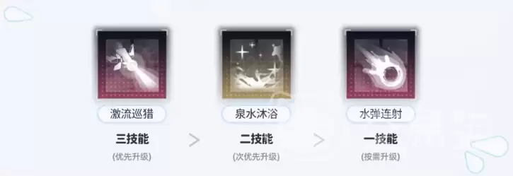 在资源有限的情况下,合理的投入顺序至关重要。技能升级的优先级建议为:三技能 > 二技能 > 一技能。因为三技能是触发核心增益“甘泉”与核心减益“水蚀”的关键,升级可延长状态持续时间,收益最高。天赋方面,应优先点满天赋4以增强“水蚀”的减益效果,随后投资天赋2来提升“甘泉”的攻击增益幅度。此加点路线能让她快速形成完整的辅助能力框架。