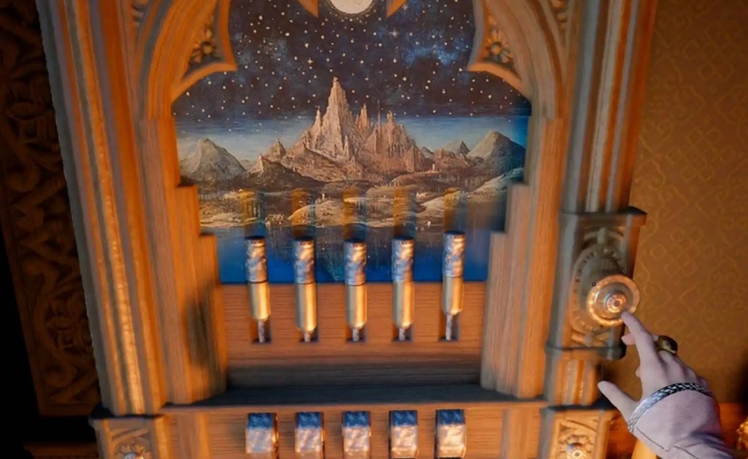 第二个保险箱同样位于大宅内。这个谜题更有意思,你需要调整五根金属柱的高度,让柱子上的分界线与底座上的风景画面对齐。