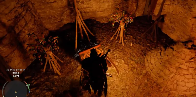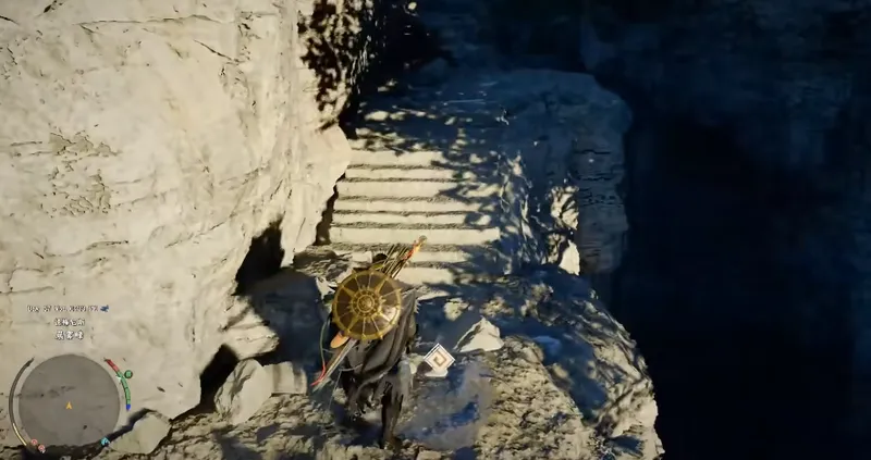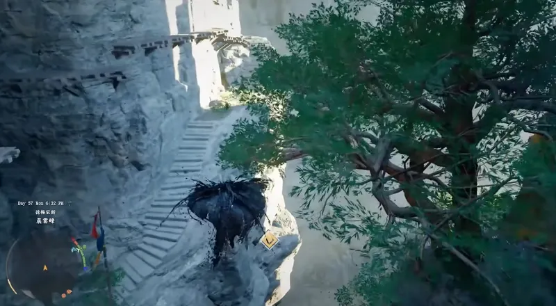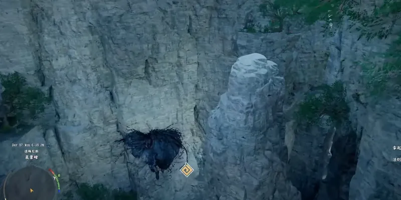 沿着右侧路径走到尽头,你会发现目标其实不在平地。抬头看,我们需要利用能力飞到尽头处的一个山崖小平台上。这才是真正的藏宝地。