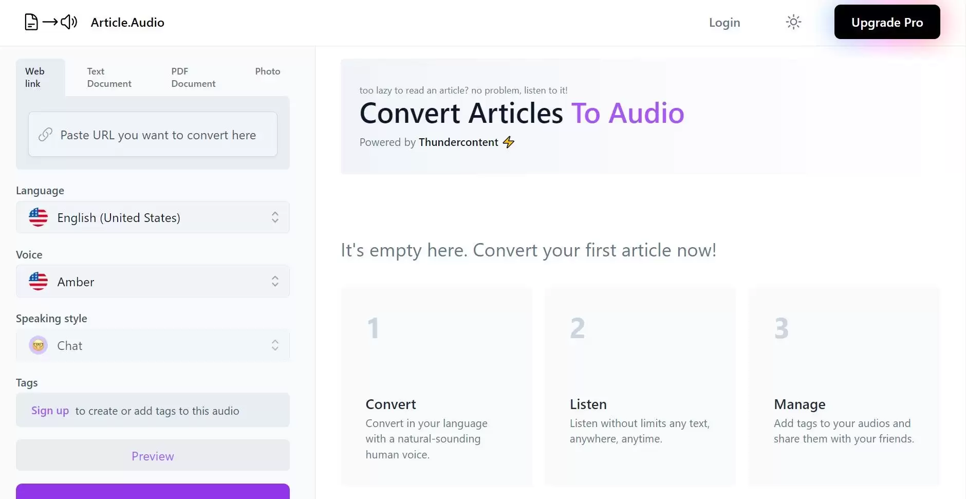 简单来说,Article.Audio的核心能力就如其名:将文章(Article)变成音频(Audio)。这项看似直接的功能,其实能覆盖不少实际场景。